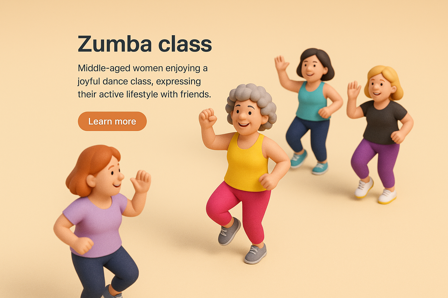 A vibrant 3D illustration depicting middle-aged women joyfully dancing in a Zumba class, showcasing their active lifestyle. The scene captures a dynamic atmosphere filled with energy and camaraderie.