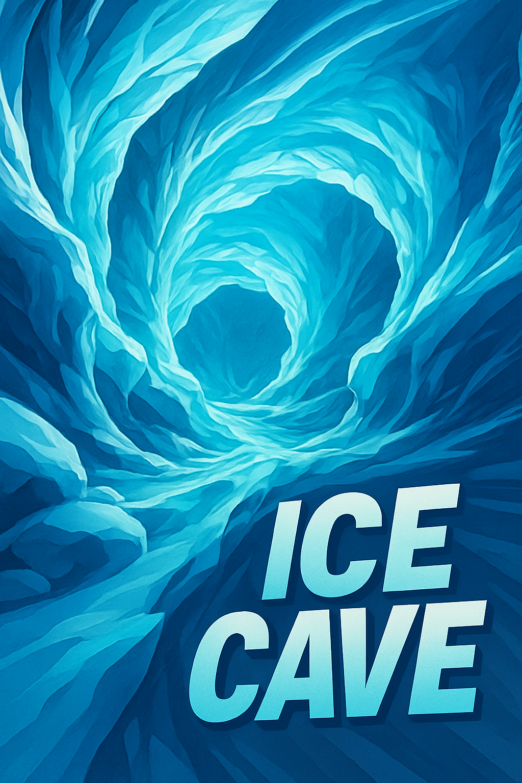 /Collection: /by davooda/Type: PNG/A striking illustration of an ice cave featuring dynamic lines and swirling patterns. The bold title 'ICE CAVE' stands out against a cool blue gradient background, emphasizing the icy theme.