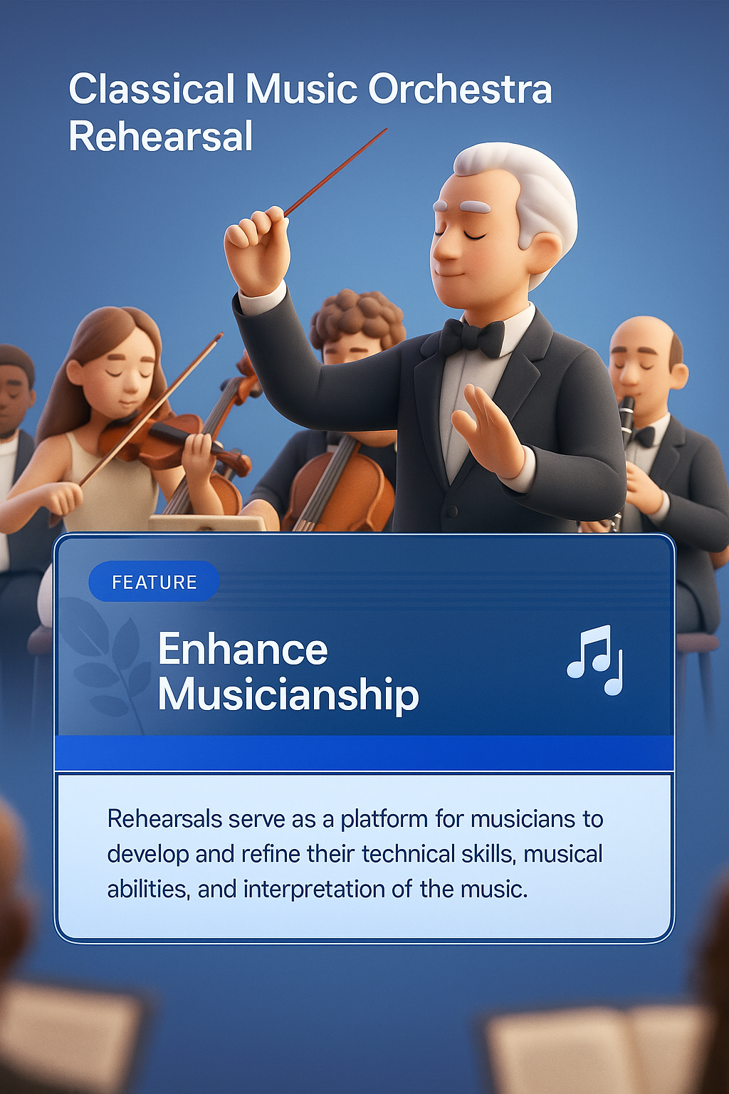 /Collection: /by davooda/Type: PNG/A vibrant 3D illustration showcasing a classical music orchestra rehearsal, featuring a conductor energetically leading musicians while a text block highlights the feature of enhancing musicianship.