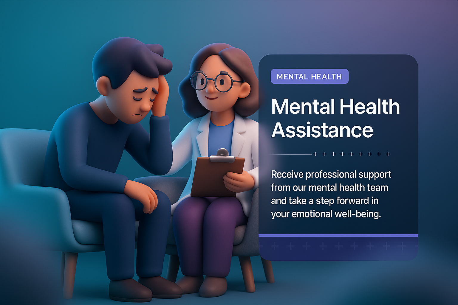 /Collection: /by davooda/Type: PNG/A 3D illustration depicting a person receiving emotional support from a mental health professional. The scene is complemented by a visually integrated information block highlighting mental health assistance.