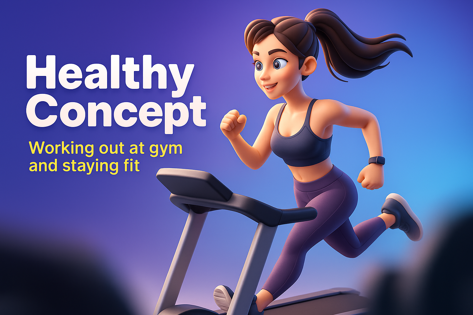 /Collection: /by davooda/Type: PNG/A vibrant 3D illustration of a woman energetically running on a treadmill in a gym setting. The background features a smooth gradient transitioning to a solid color, enhancing the dynamic feel of the scene.