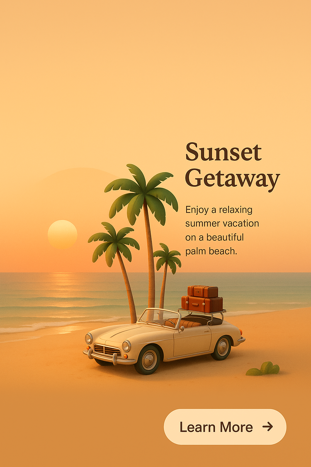 /Collection: /by davooda/Type: PNG/A serene retro beach scene featuring a luxury car with luggage parked on a sandy shore. Palm trees frame the sunset, creating a tranquil atmosphere perfect for a summer vacation.