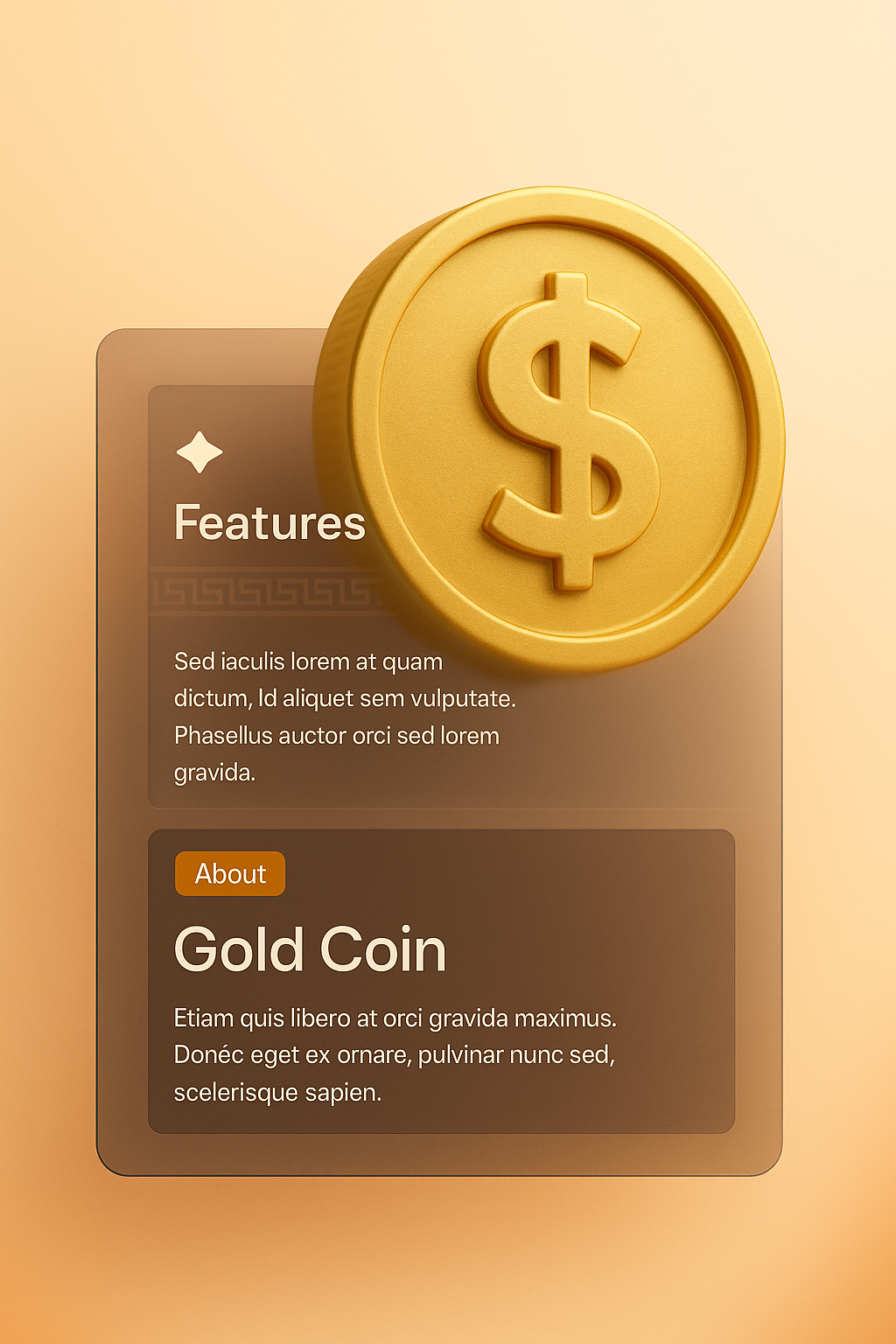 A 3D gold coin prominently displayed with an overlay featuring a modern design. The background transitions smoothly, enhancing the visual appeal of the coin and text.