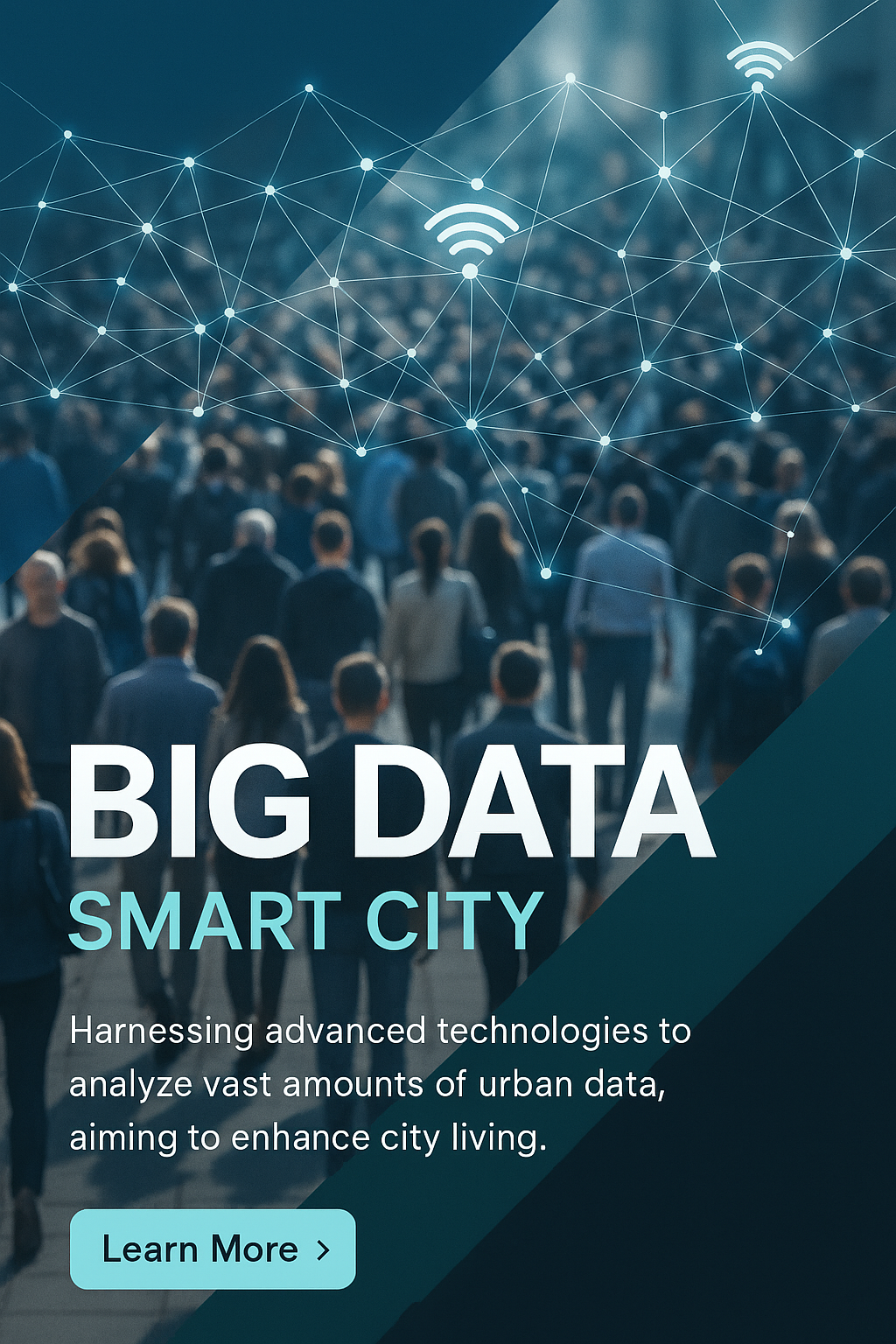 A visually engaging representation of a crowd with a network of connections, highlighting big data and smart city concepts. Features layered geometric design elements and a call-to-action button.