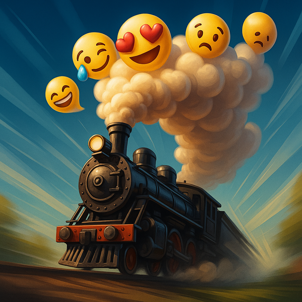 /Collection: /by davooda/Type: PNG/An old steam train emits smoke formed into various emojis, set against a dynamic background with rays spreading from the center. The scene balances realism and artistic flair.