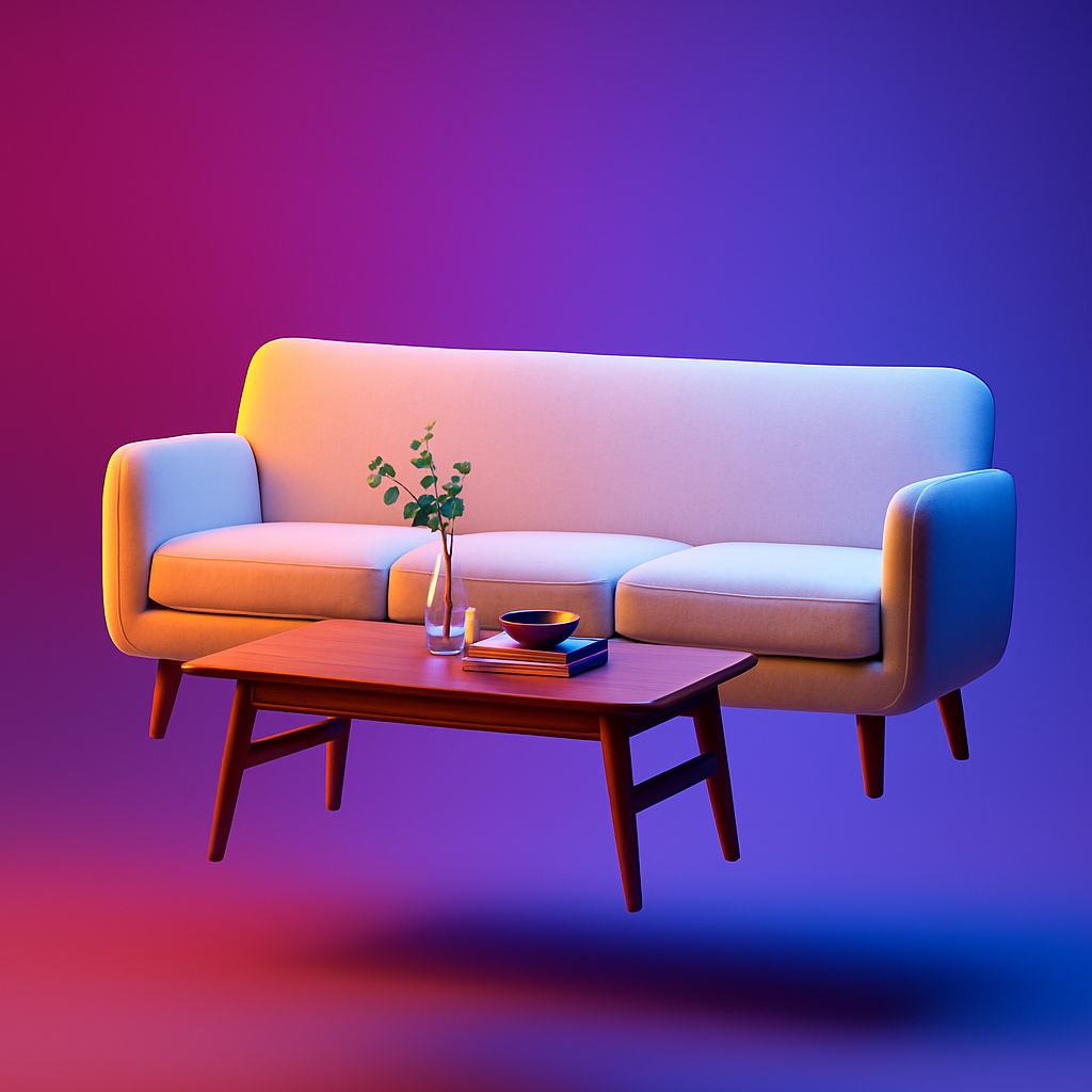 An elegantly designed mid-century living room featuring a floating white sofa and a wooden coffee table, highlighted with contrasting lighting against a smooth, vibrant background.