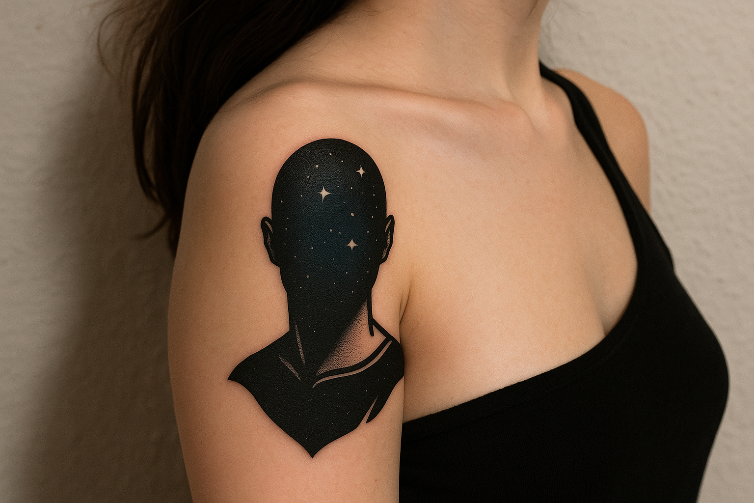 /Collection: /by davooda/Type: PNG/The image showcases a striking tattoo on a woman's elegant shoulder, depicting a silhouette filled with a starry cosmic design, blending artistry with femininity.