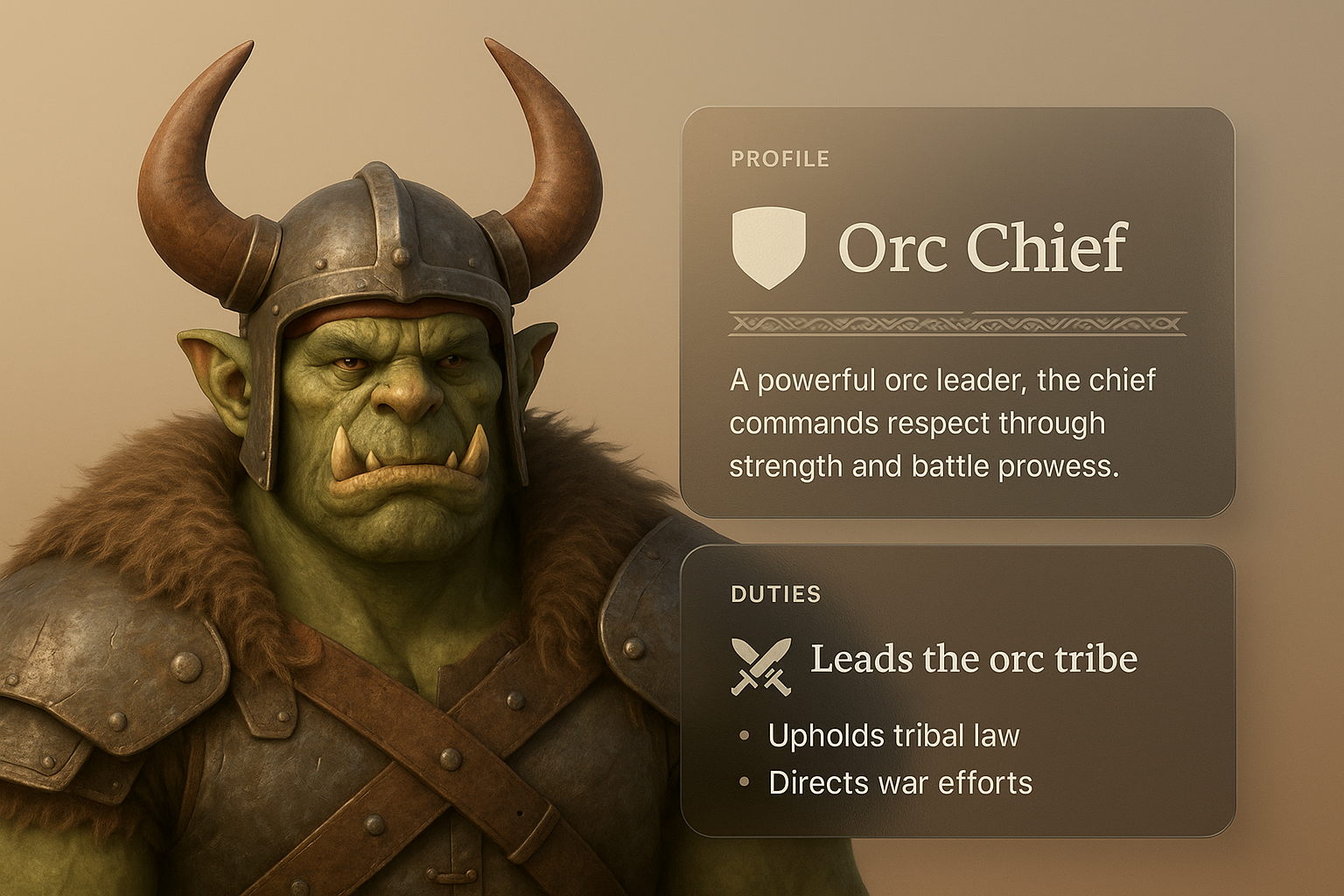 A 3D illustration of a powerful orc chief, featuring a textured background and an overlay with profile and duties. The design integrates a cohesive layout with readable text.