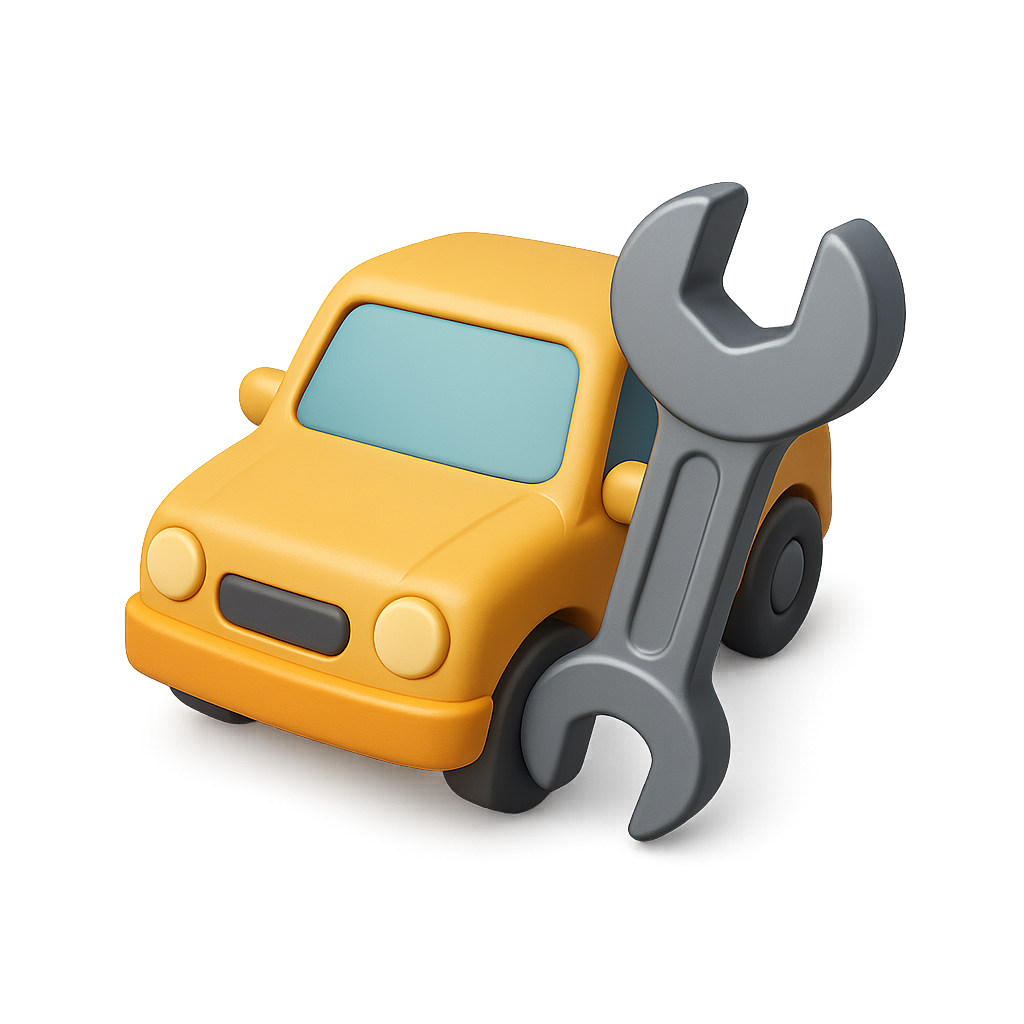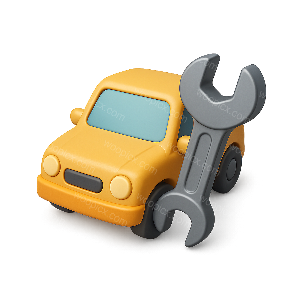 A stylized 3D icon featuring a yellow car alongside a gray wrench, designed with a transparent background and a three-quarter isometric view, highlighting a playful and modern aesthetic.