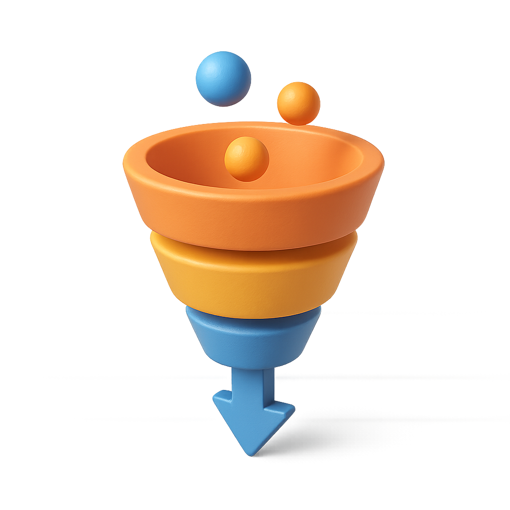 /Collection: /by davooda/Type: PNG/A vibrant 3D funnel icon featuring three concentric sections in orange, yellow, and blue, with floating spheres above. The design showcases a modern, isometric style suitable for conversion optimization themes.