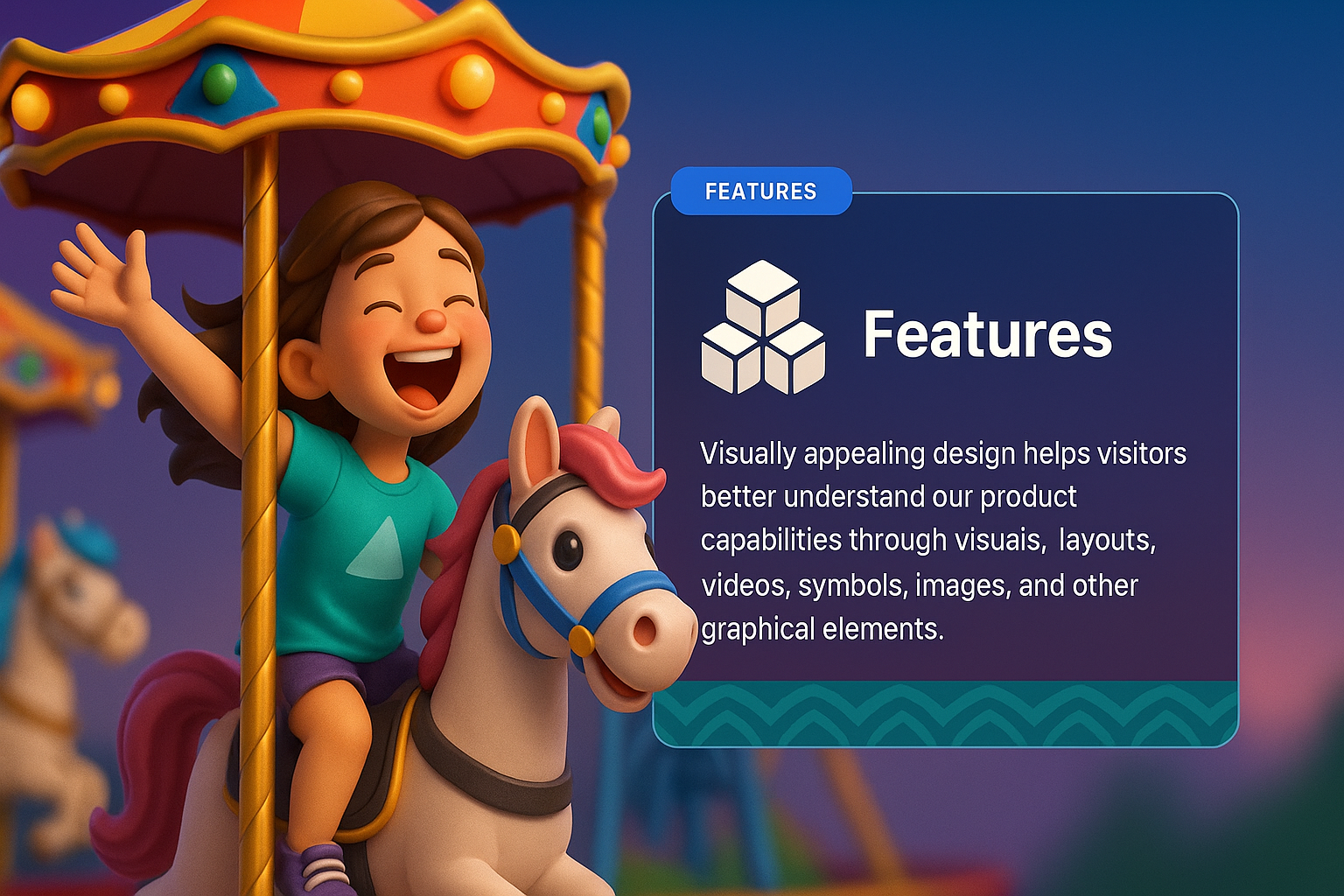 /Collection: /by davooda/Type: PNG/A joyful young girl rides a vibrant carousel, showcasing her excitement. The scene captures a colorful amusement park atmosphere, complete with playful design elements.
