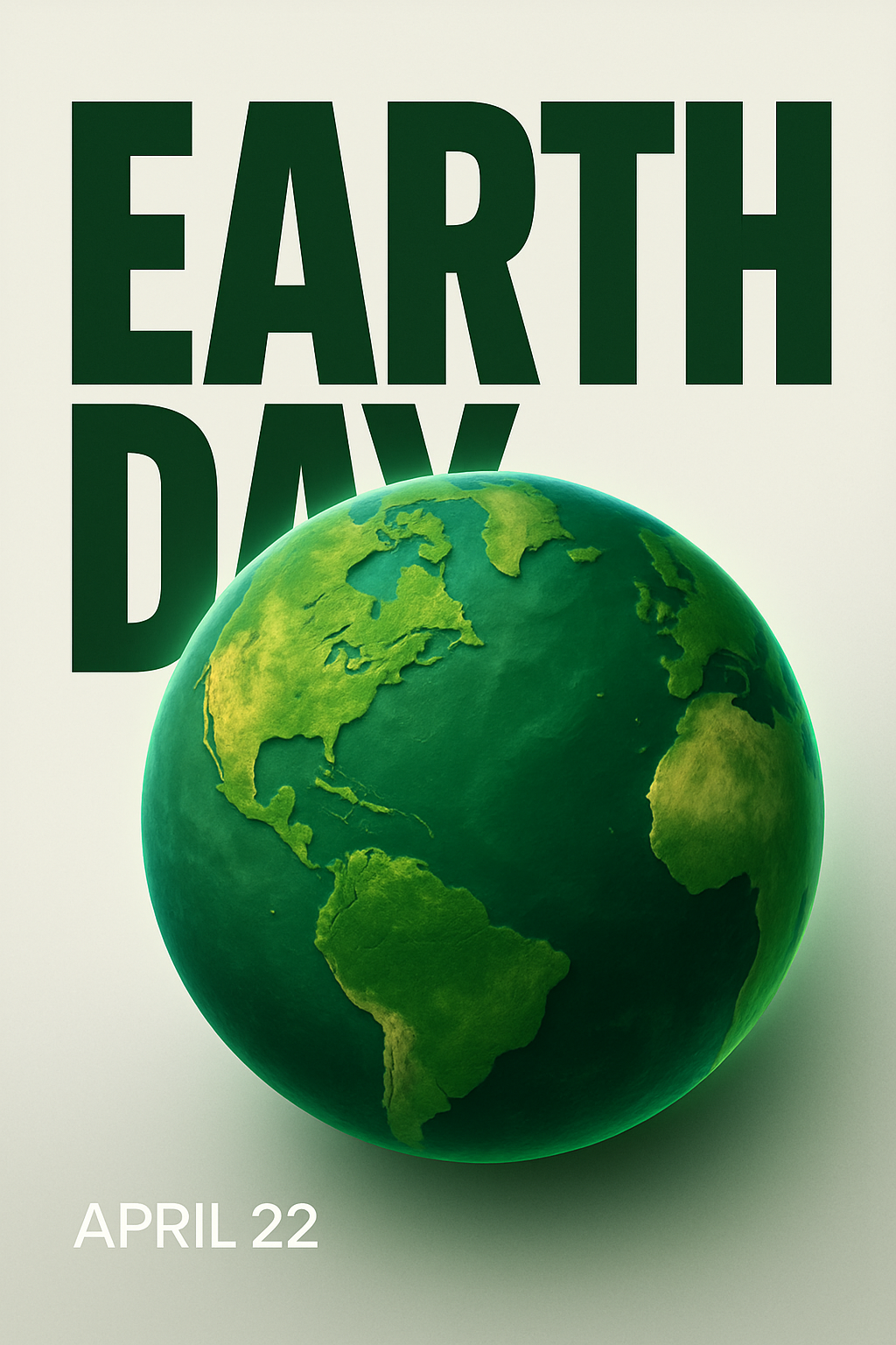 /Collection: /by davooda/Type: PNG/A striking illustration of a green planet Earth set against a subtle gradient background. The design features oversized bold typography for 'Earth Day' and additional details in thin white font, creating a modern and cinematic aesthetic.
