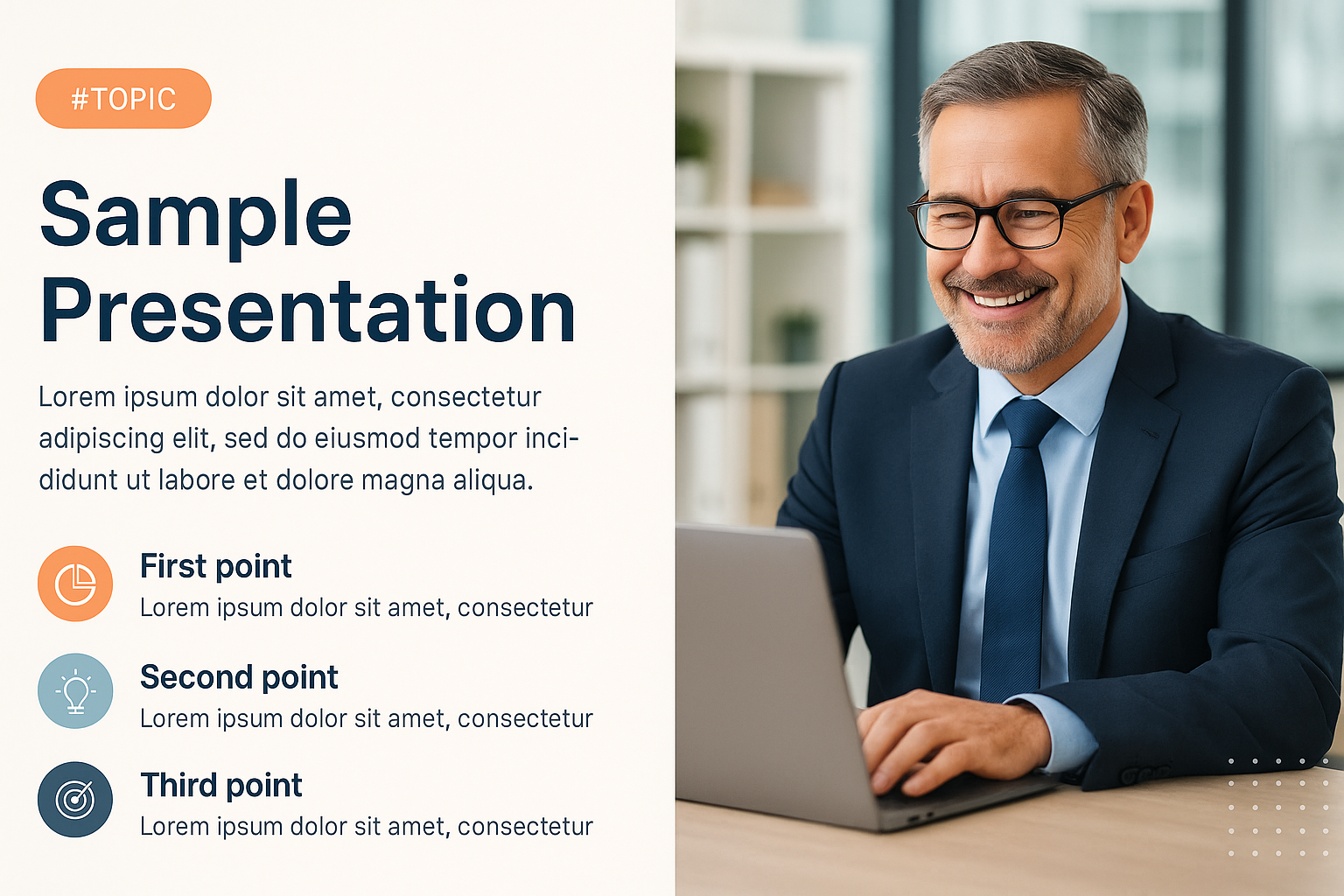 A modern presentation slide featuring a smiling professional next to key discussion points. Ideal for business meetings and webinars, this design emphasizes clarity and engagement.