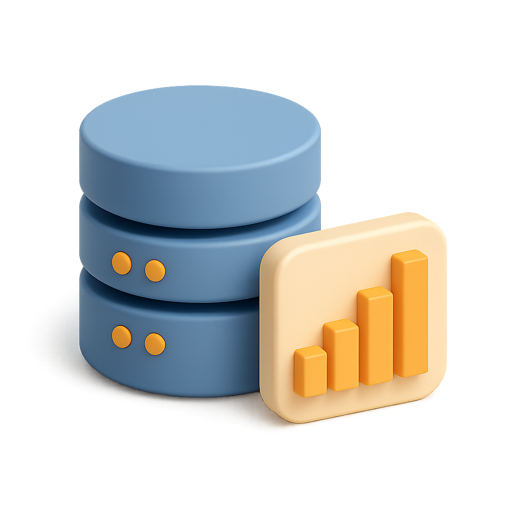 A visually appealing 3D icon featuring a database structure and a chart, symbolizing big data. The design incorporates a three-quarter view with a modern, isometric style.