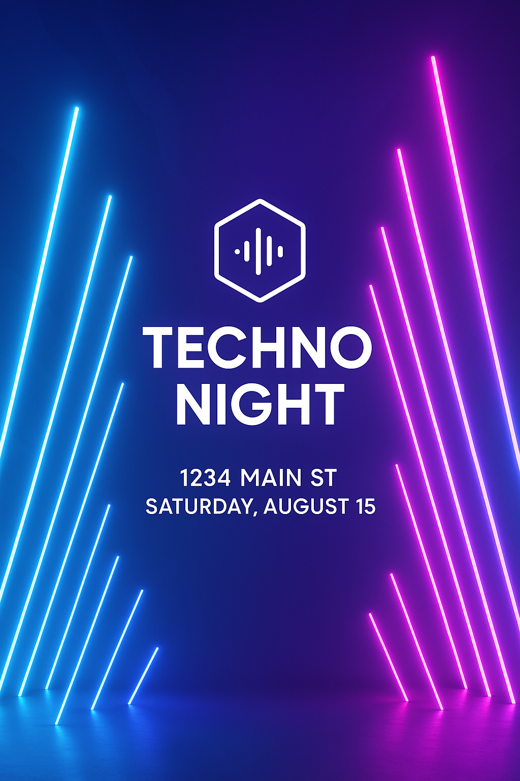 Dynamic event poster featuring neon light beams against a gradient background, ideal for promoting nightlife events and music festivals.