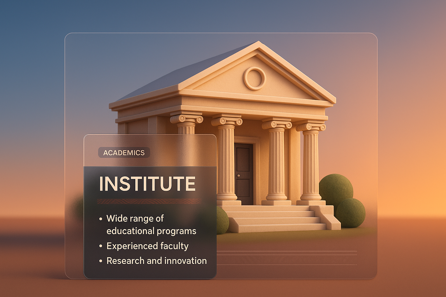 /Collection: /by davooda/Type: PNG/A visually appealing 3D illustration of an academic institute, featuring a classical building with columns. The design includes transparent panels displaying information about educational programs and faculty.