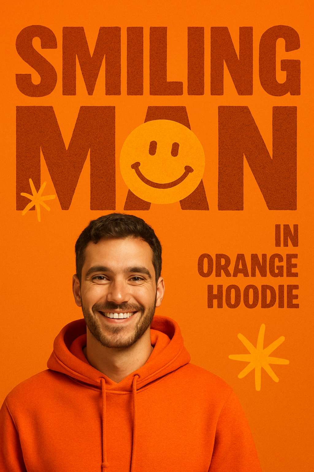 Cheerful Portrait of a Man in an Orange Hoodie with Playful Typography