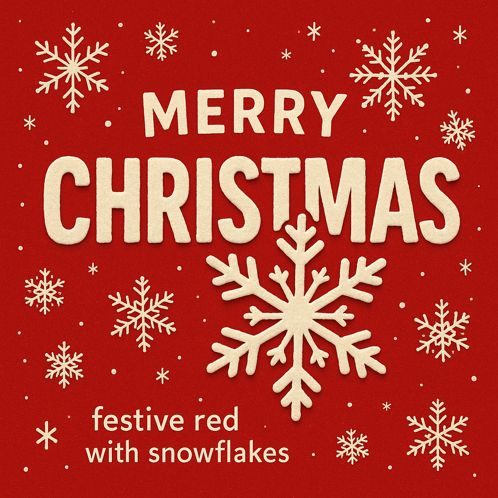 Vibrant Christmas card graphic featuring bold 'Merry Christmas' text and snowflake illustrations on a festive red background, ideal for holiday greetings.