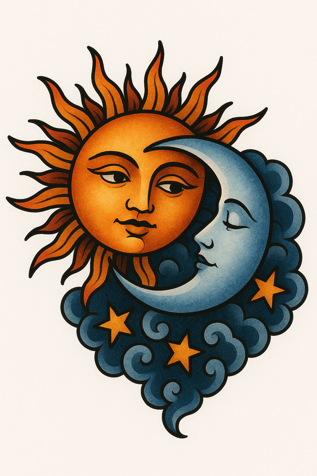 A visually striking illustration featuring a stylized sun and moon face intertwined with clouds and stars. Ideal for artistic projects or tattoo design.