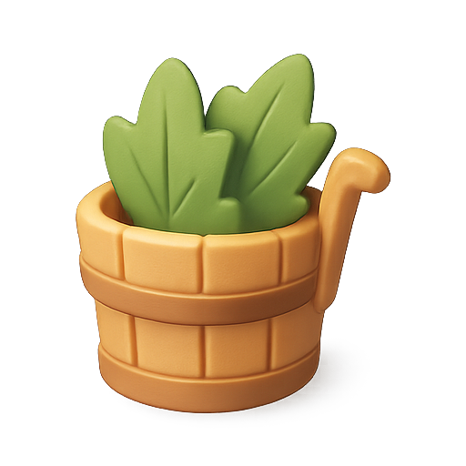 A vibrant, cartoon-style illustration of a wooden pot containing green leaves, ideal for gardening or nature-themed designs. Perfect for use in applications related to plants or eco-friendly topics.