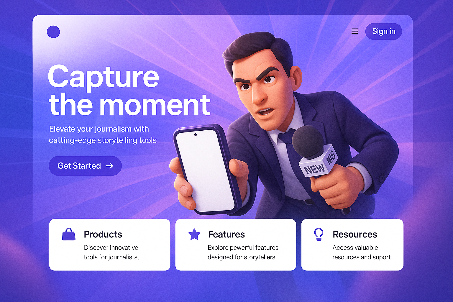 A vibrant landing page design featuring a dynamic journalist holding a phone, showcasing storytelling tools. The layout includes engaging sections for products, features, and resources.