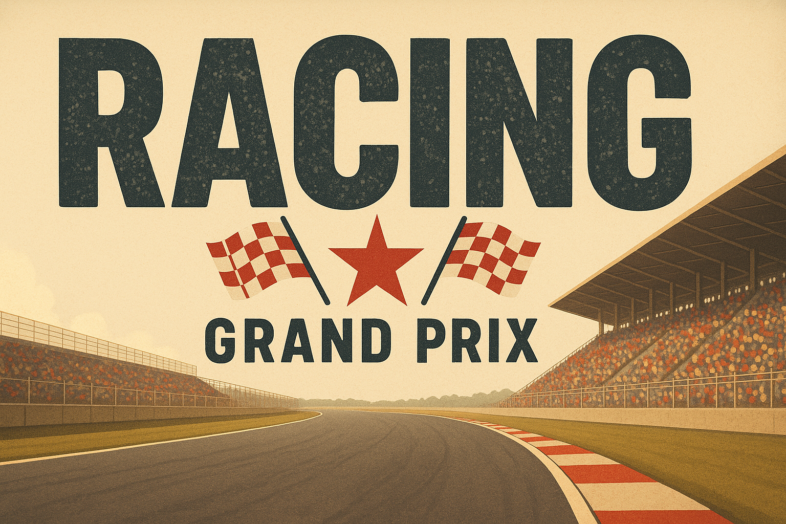 Stylized promotional graphic for a Racing Grand Prix event featuring retro design elements, ideal for motorsport enthusiasts and event marketing.