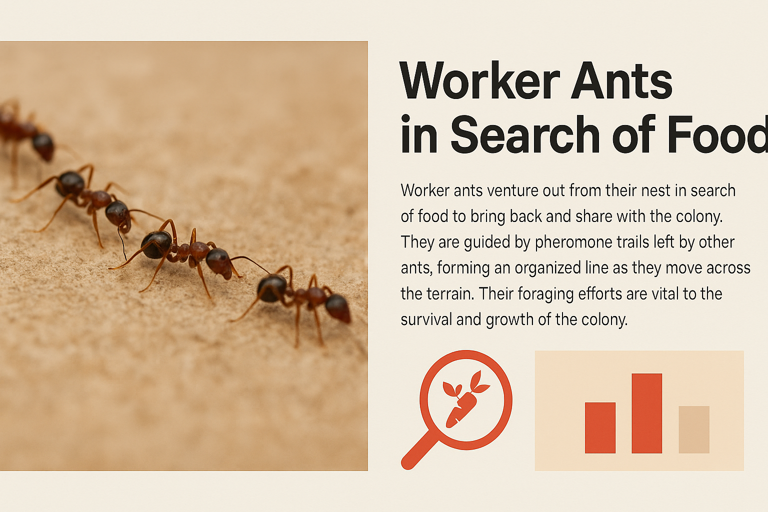 /Collection: /by davooda/Type: PNG/An educational infographic showcasing worker ants in search of food, highlighting their organized behavior and the importance of foraging to the colony's survival. Ideal for nature or biology presentations.