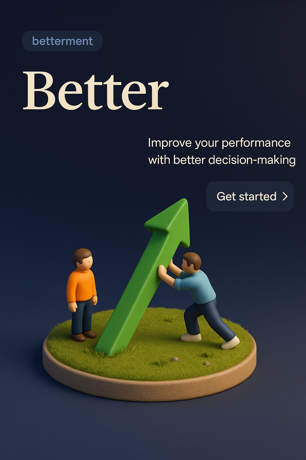 /Collection: /by davooda/Type: PNG/A visually engaging 3D scene illustrating personal growth, featuring two characters interacting with a large green upward arrow, set against a dark gradient background.