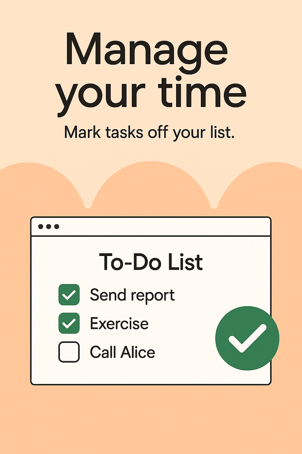 A minimalist graphic illustrating a to-do list with checkmarks, designed to promote time management and productivity. Ideal for apps, blogs, or presentations focused on organization.