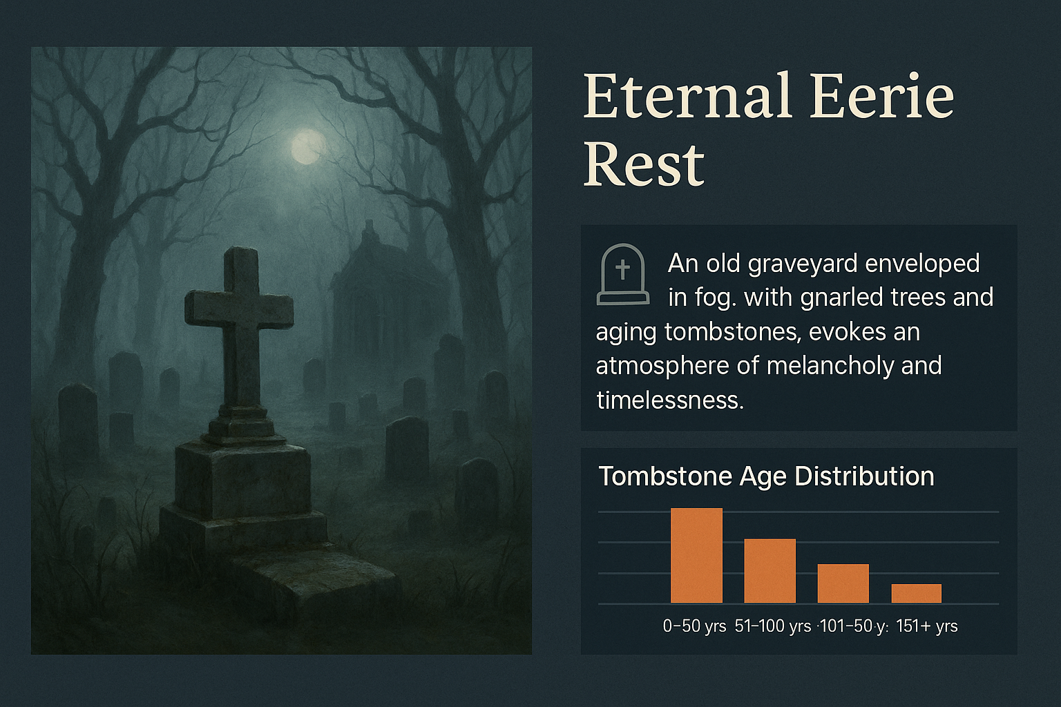 /Collection: /by davooda/Type: PNG/A haunting illustration of an old graveyard, featuring tombstones and fog, paired with a data visualization on tombstone age distribution, ideal for Halloween-themed content.