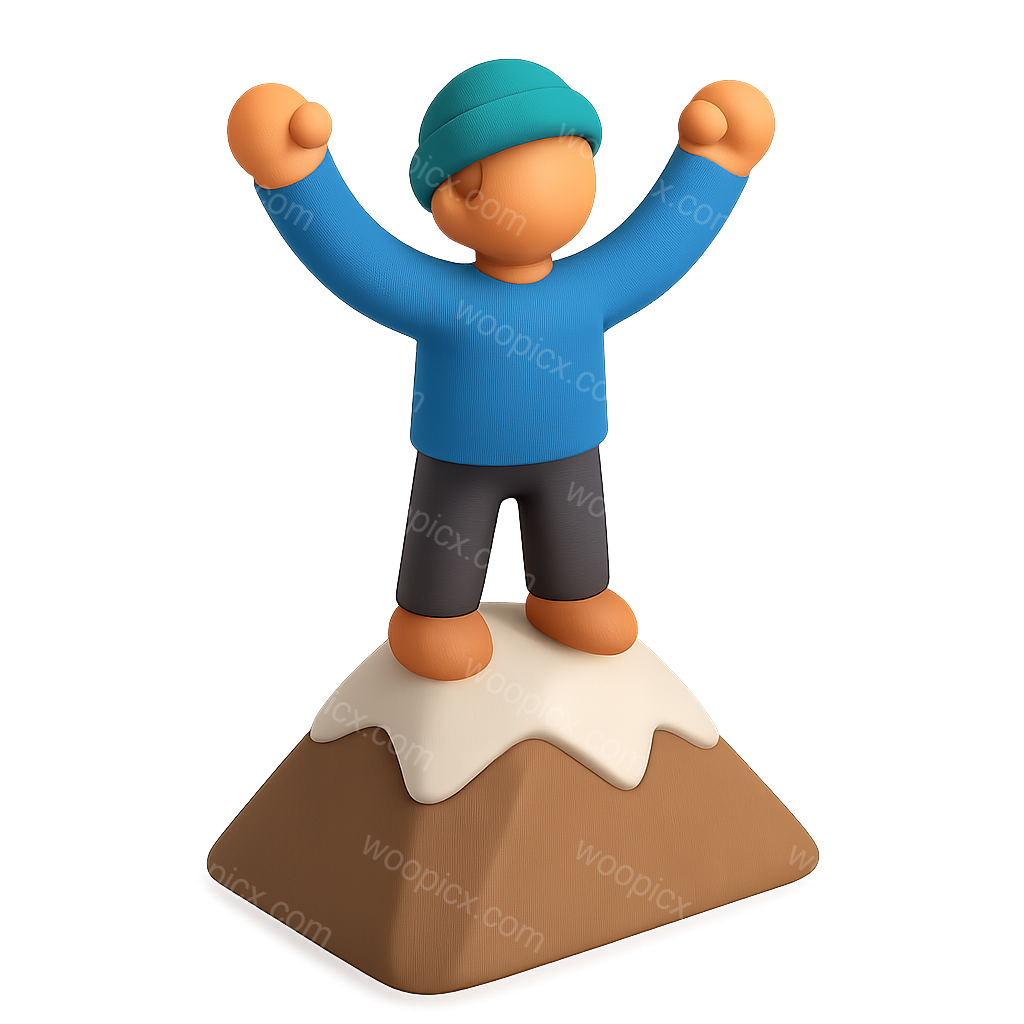 /Premium/Collection: /by davooda/Type: PNG/A 3D icon featuring a joyful person celebrating atop a stylized mountain, complete with a snow cap. The character wears a blue sweater and a beanie, with arms raised in triumph.