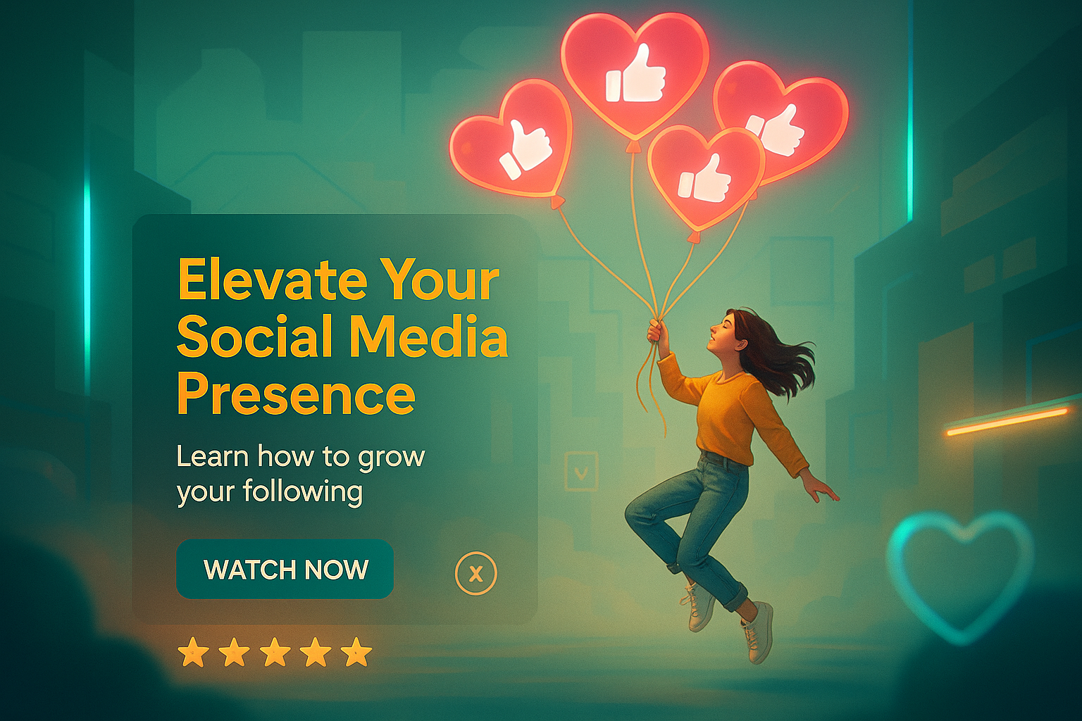 /Collection: /by davooda/Type: PNG/A vibrant digital illustration showcasing a person holding balloons shaped like hearts with thumbs up icons, aimed at promoting social media growth strategies. Ideal for online marketing and educational content.