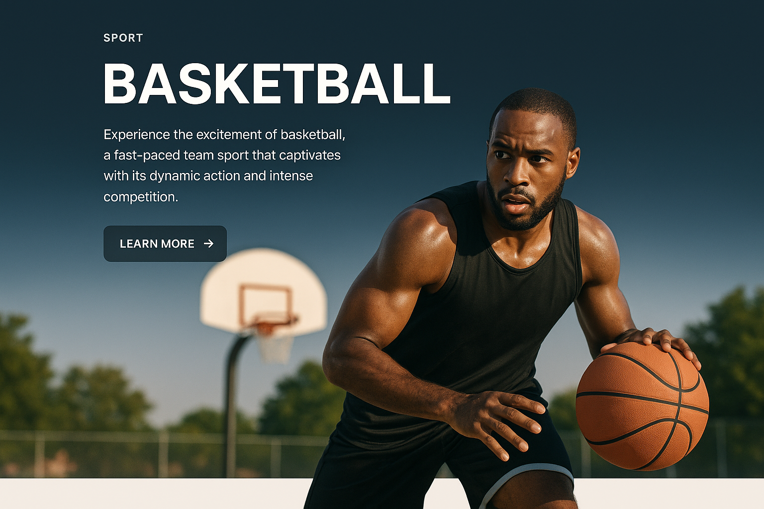 A stylish basketball-themed design featuring a player in action, suitable for a web page. The layout includes engaging text and a call-to-action button.