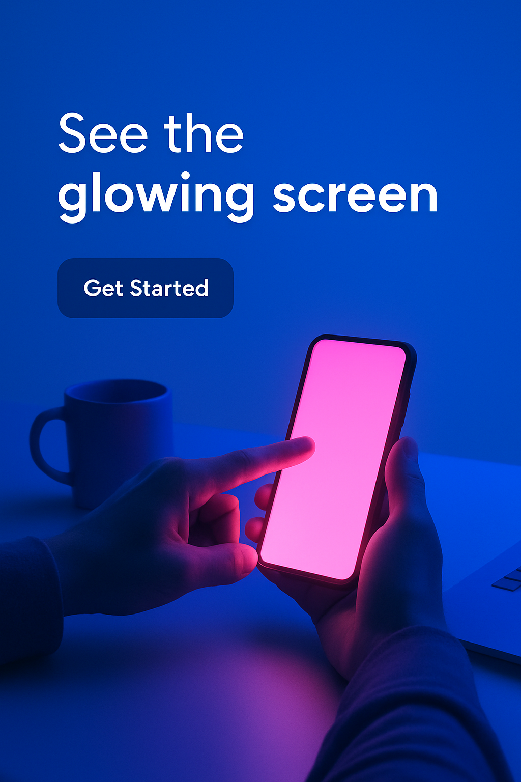 A person points at a neon-pink glowing phone screen against a solid blue background. Soft light illuminates the surroundings, creating a cool atmosphere. A coffee mug is visible.