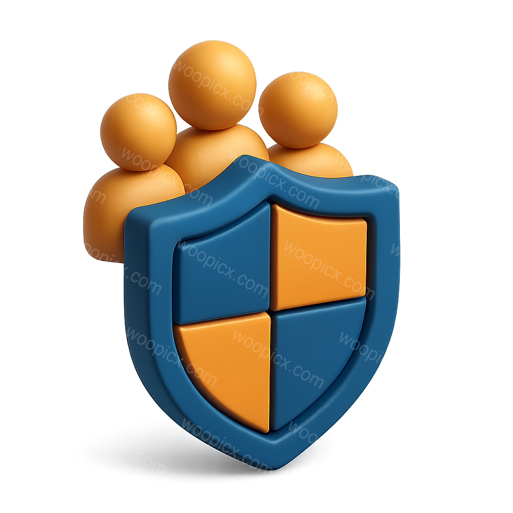 /Premium/Collection: /by davooda/A visually engaging 3D icon featuring a shield with orange and blue colors, accompanied by three stylized figures in the background. The design is isometric and has a volumetric feel.