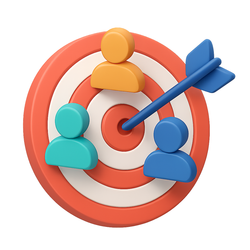 This image features a 3D target audience icon, showcasing colorful profiles on a bullseye with an arrow hitting the center. The design has an isometric and volumetric feel, set against a transparent background.