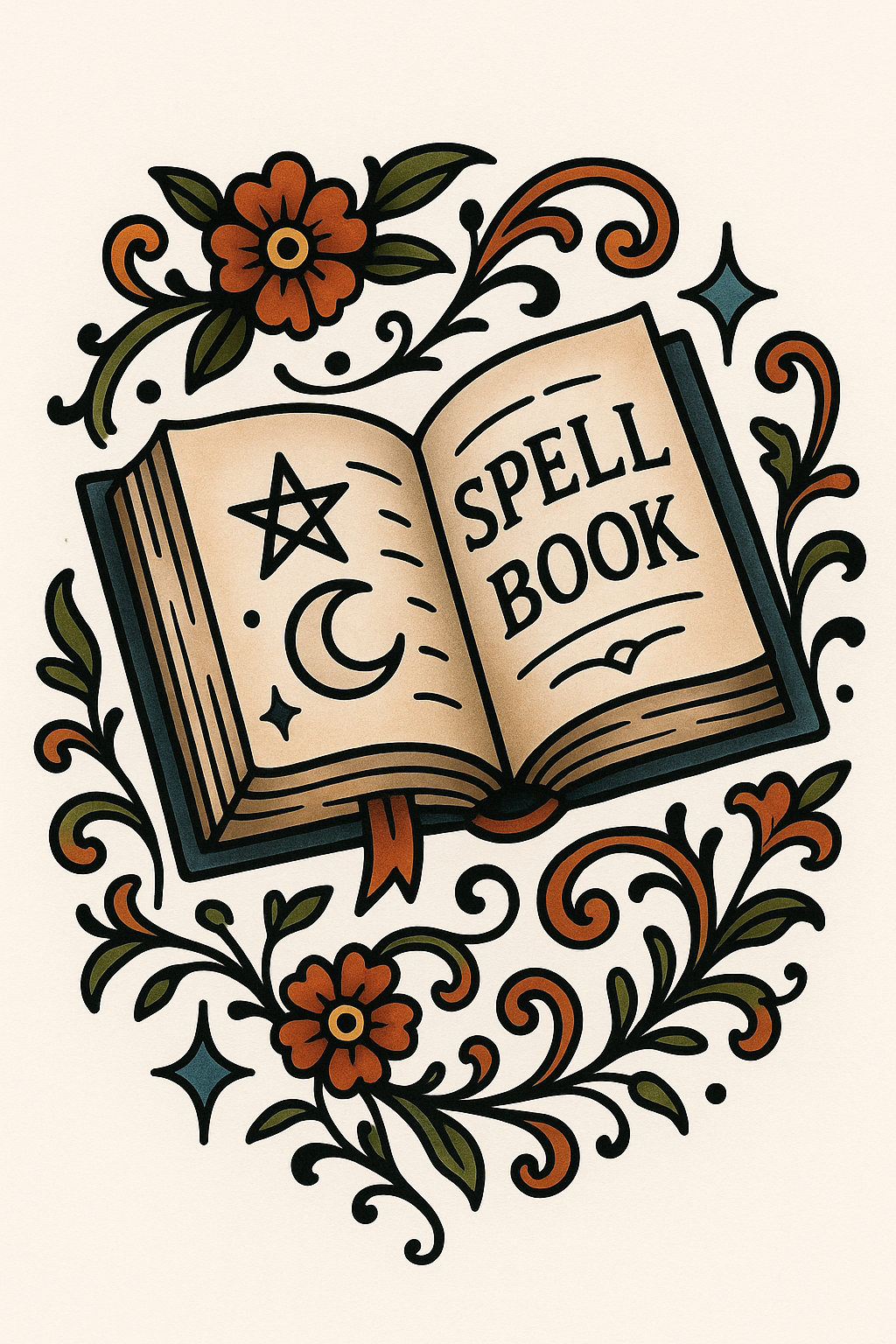A whimsical illustration of an open spell book adorned with floral patterns and magical symbols, ideal for fantasy-themed projects or merchandise.