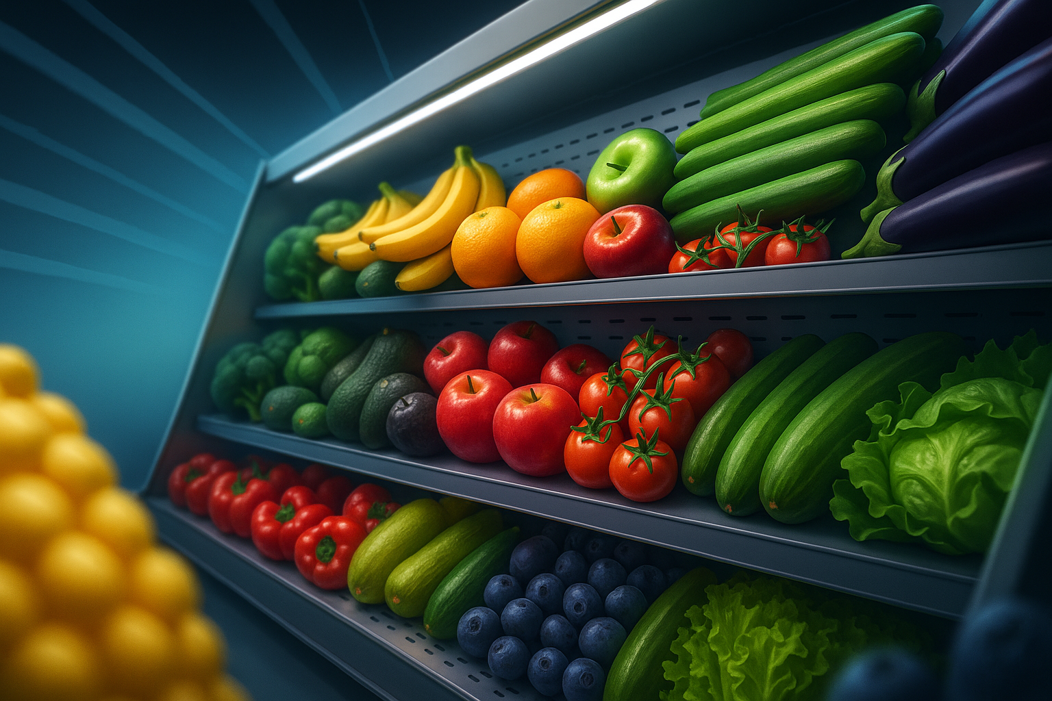 Vibrant Fruits and Vegetables in Supermarket Refrigerated Shelf