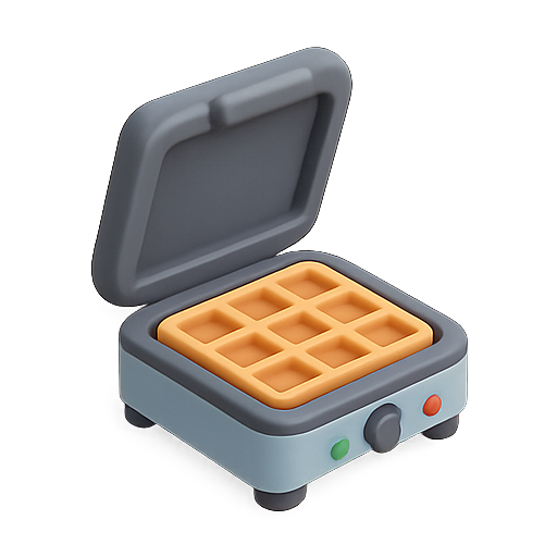 A modern, stylized icon of a waffle maker with an open lid showcasing a waffle. The design features a sleek, minimalist aesthetic suitable for culinary apps or food-related websites.