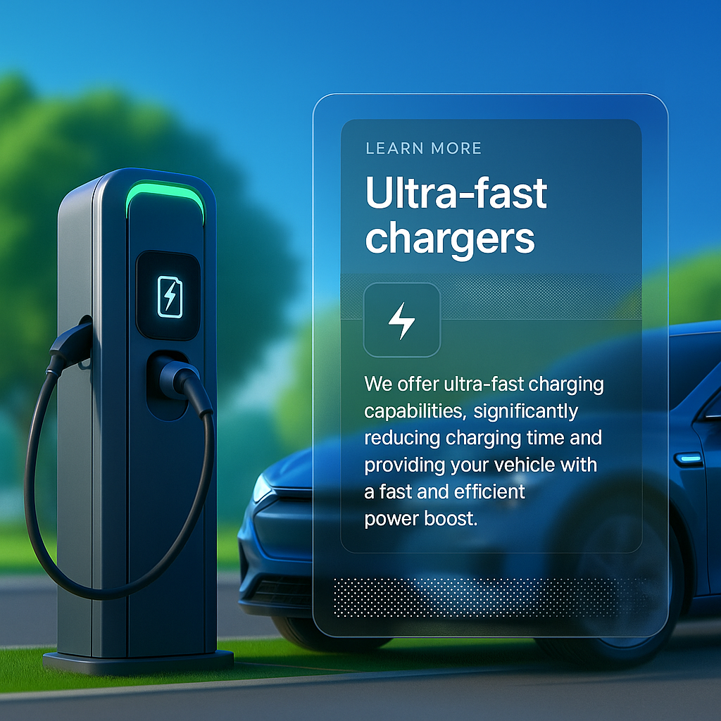 /Collection: /by davooda/Type: PNG/A sleek electric vehicle charging station with a modern design, surrounded by a park-like environment. It features a clear information block highlighting ultra-fast charging capabilities.