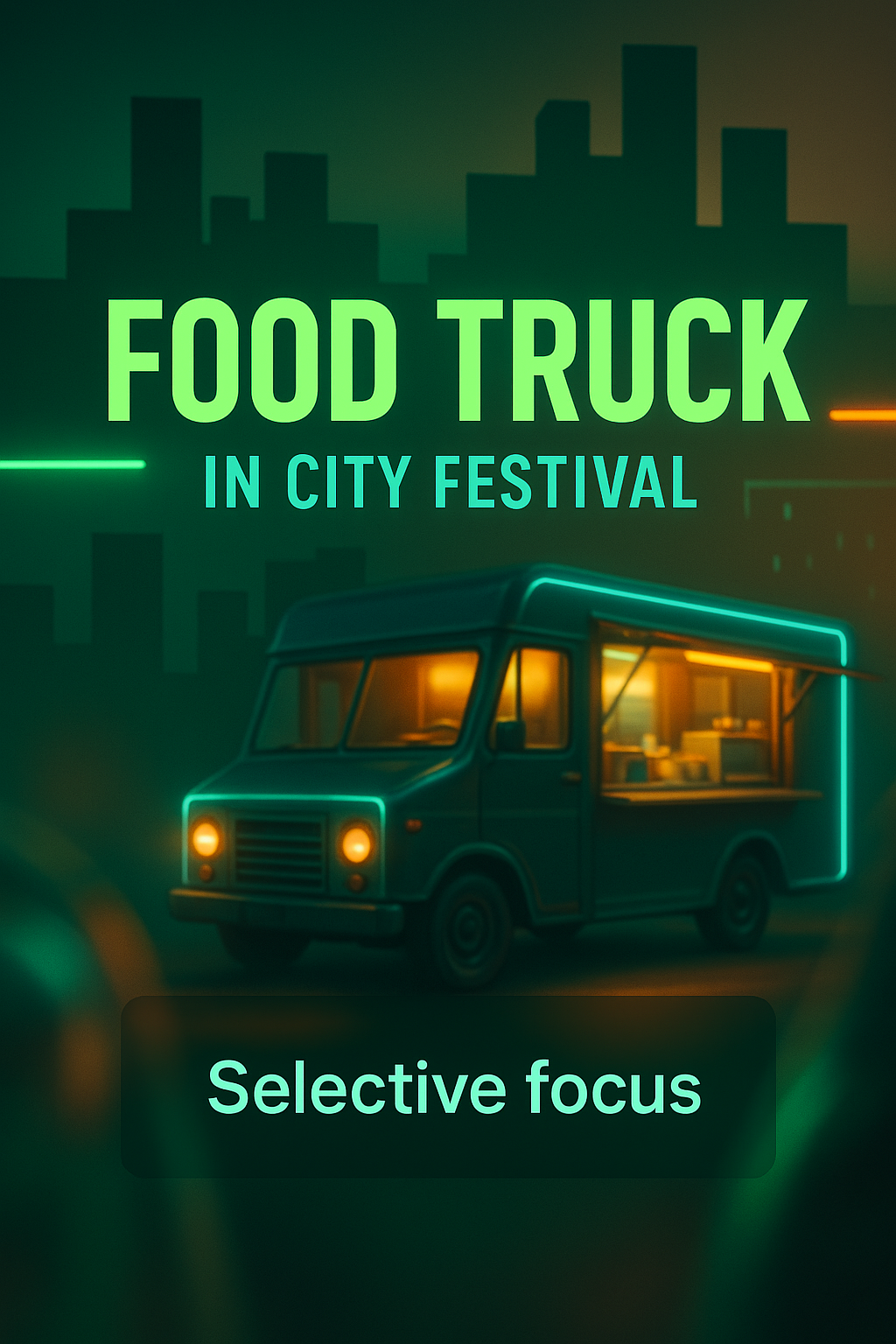 Illustrative graphic featuring a food truck in a city festival setting, utilizing vibrant colors and selective focus to create an engaging atmosphere, ideal for event promotion or marketing.