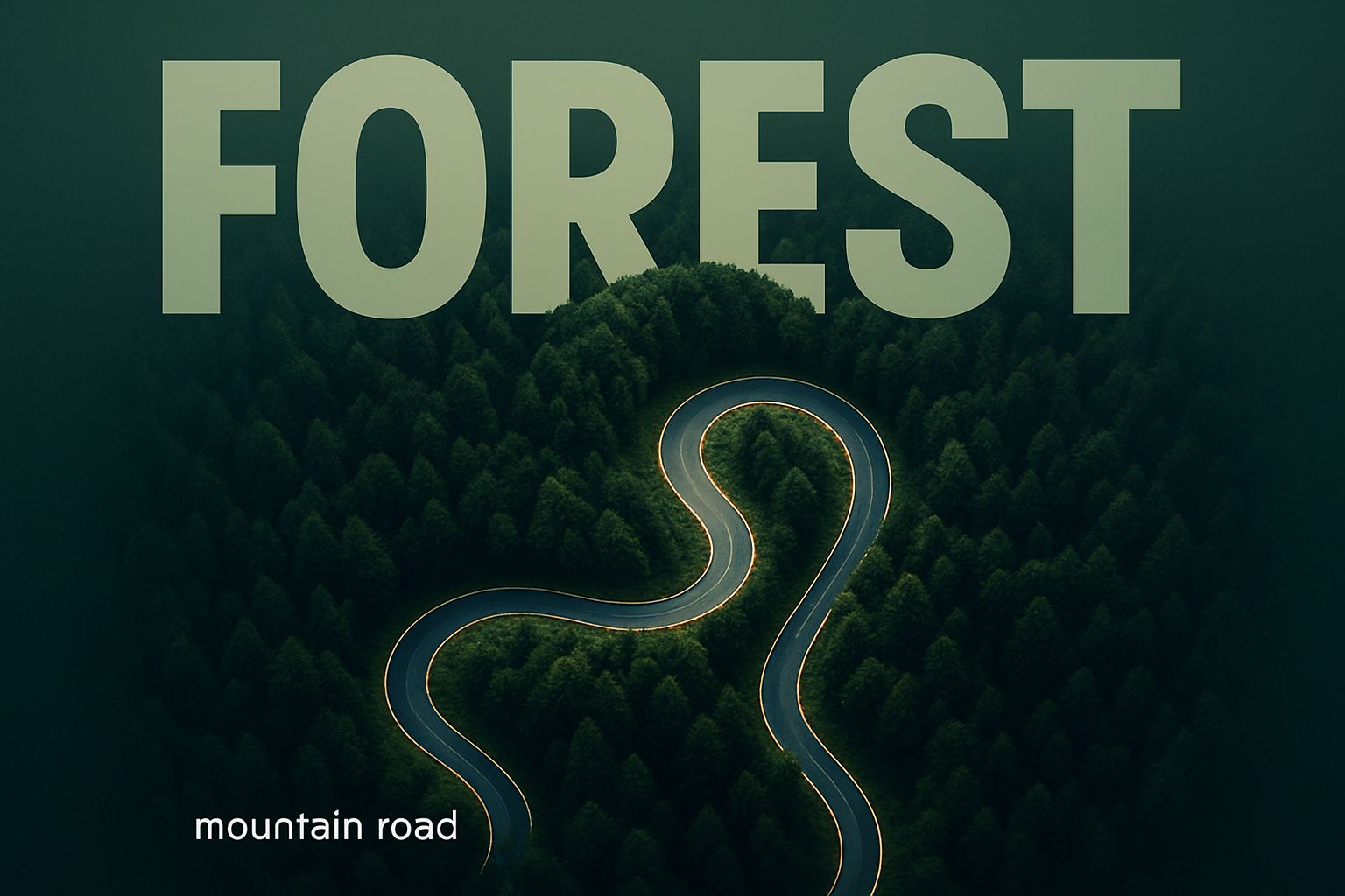 /Collection: /by davooda/Type: PNG/This image showcases an aerial top view of a winding mountain road surrounded by a lush, dark green forest. The composition features a powerful minimalistic style with a bold headline and subtle gradient background.