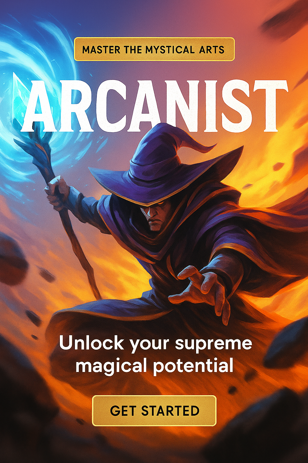 /Collection: /by davooda/Type: PNG/A captivating design featuring an arcanist wielding magic, set against a dynamic gradient background. The text highlights the theme of unlocking magical potential.