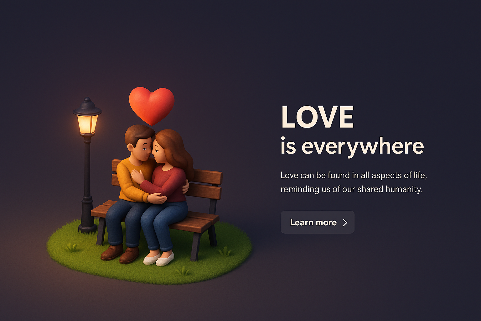 A visually appealing 3D representation of a couple on a park bench, surrounded by a dark gradient background. A heart hovers above them, symbolizing love's presence.