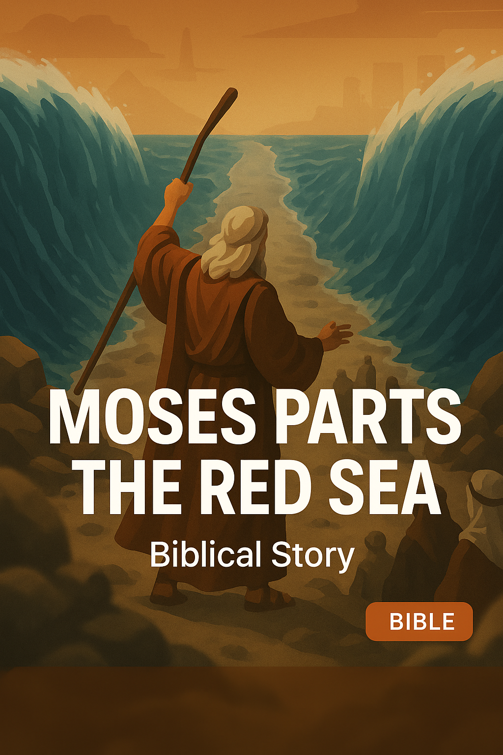 /Collection: /by davooda/Type: PNG/Artistic representation of Moses parting the Red Sea, capturing a key biblical story with warm colors and a dramatic landscape. Ideal for religious publications or educational materials.