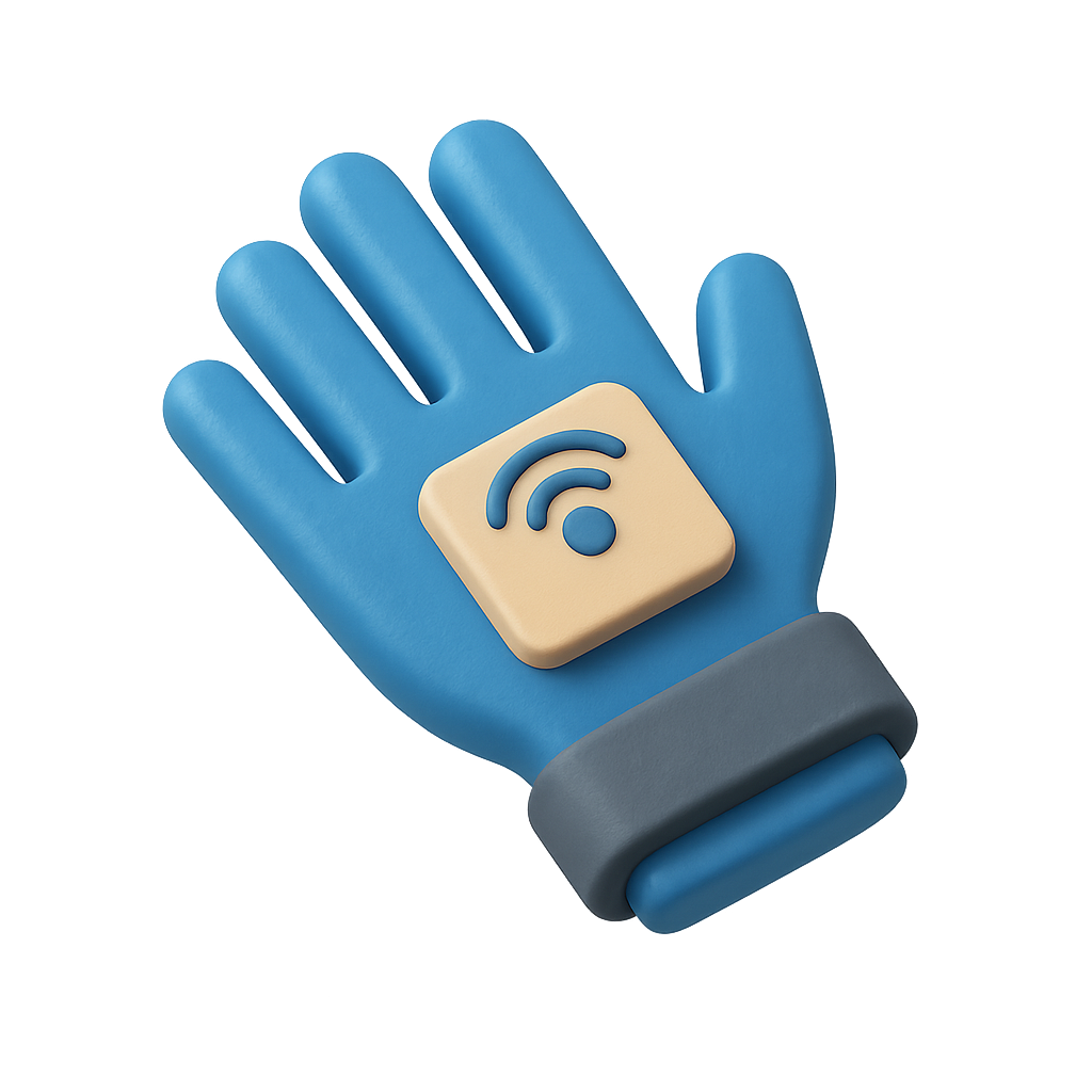 /Collection: /by davooda/Type: PNG/A visually appealing 3D icon of a tactile feedback glove, featuring a blue color scheme and a wireless symbol on a beige square. The design showcases a three-quarter view with a modern, isometric look.