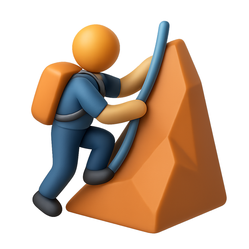 A stylized 3D icon depicting a mountain climber in mid-ascent, featuring a bright orange climbing surface and a climber in blue attire with an orange backpack, set against a soft gradient background.