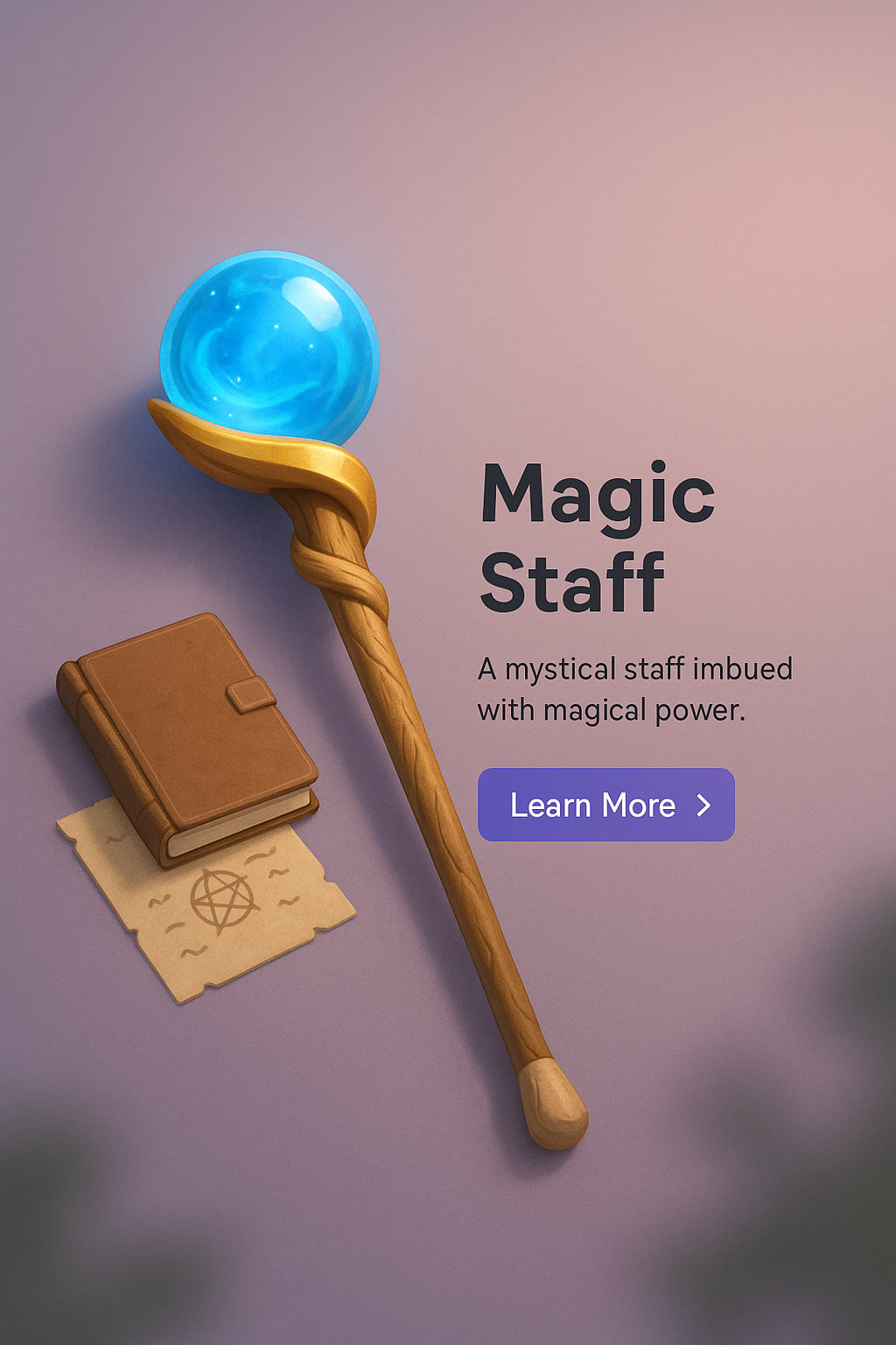A beautifully crafted 3D illustration of a magic staff featuring a glowing blue orb and a wooden handle. Accompanied by a spellbook and a parchment, it creates a mystical atmosphere.
