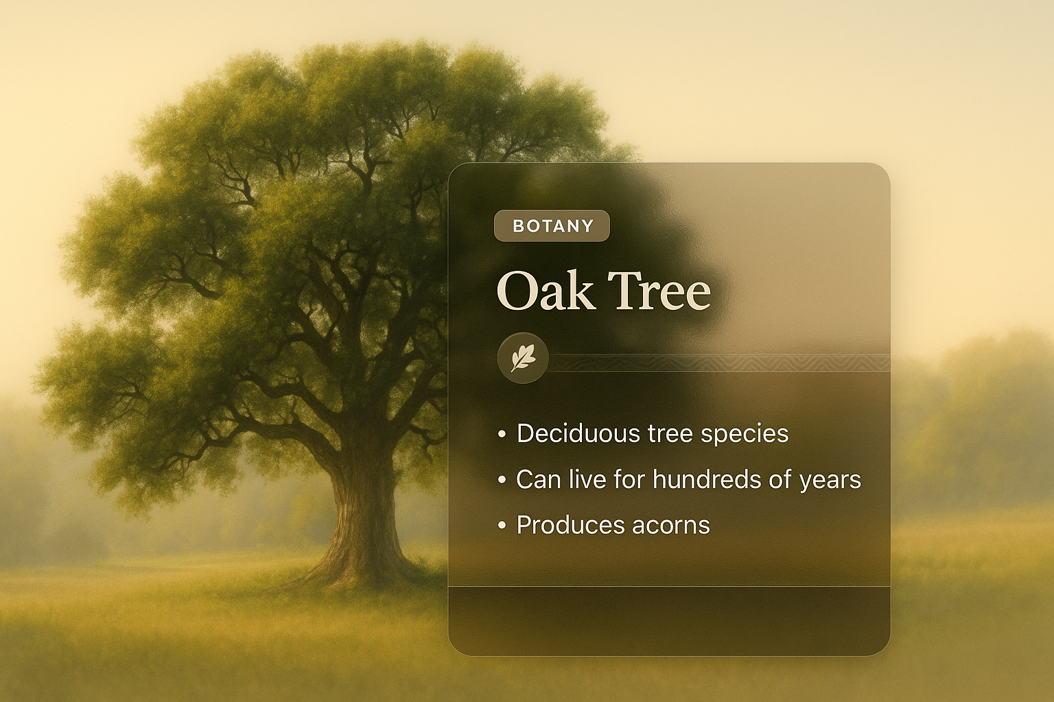 /Collection: /by davooda/Type: PNG/This image features a majestic oak tree set against a soft gradient background. An informative overlay includes key details about the oak tree, enhancing its visual appeal.