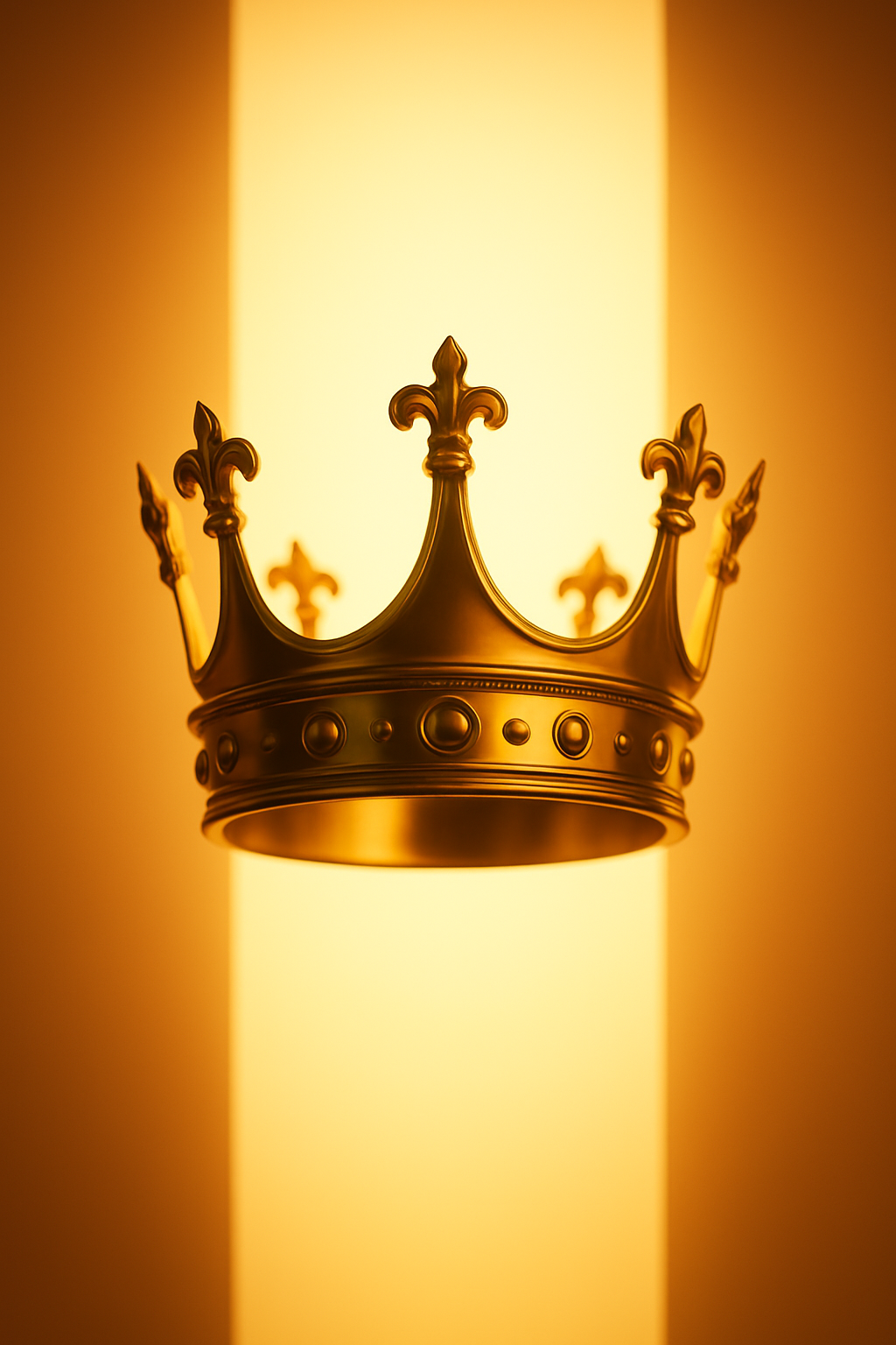 A majestic golden crown floats in mid-air, illuminated by a bright gradient background. The regal design and backlit effect enhance its grandeur and elegance.
